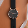 Step into timeless sophistication with the Aureva Embellished Watch — where modern elegance meets classic charm. Designed with a sleek black dial accented by subtle vertical stripes and sparkling crystal markers, this watch captures the essence of quiet luxury.The rose gold case adds a warm, radiant contrast, while the soft black strap ensures comfort with every wear.