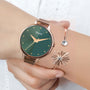 Make every occasion special with this elegant women’s Jade watch and bracelet combo. The stylish wristwatch showcases a vibrant green dial with a rose gold mesh strap, offering a bold and fashionable look. Paired with a dazzling open bracelet featuring a sunshine design and crystal detail, this set adds a touch of sparkle and glamour to your style. Perfect for everyday elegance, office wear, or festive celebrations, this combo also makes a charming gift for loved ones. Sleek, lightweight, and versatile, it’s designed to complement any outfit effortlessly.