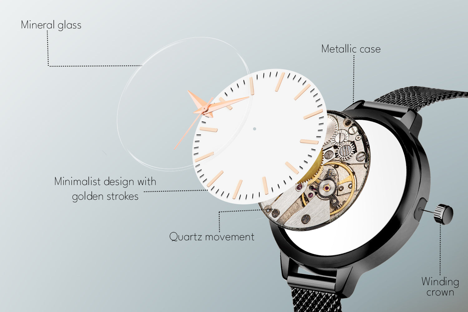 Presenting Starlit Wristwatch: this epitomizes sophistication for any woman feeling connected to luxury at its best. Perfectly merged into modern style with the unbeatable comfort of unmatched, black metal-strapped wristwatch that catch every eye. It is a beautiful timepiece from which a pristine white dial radiates and is supported with rose-gold markers and hands that create appeal towards minimalism and beauty.
